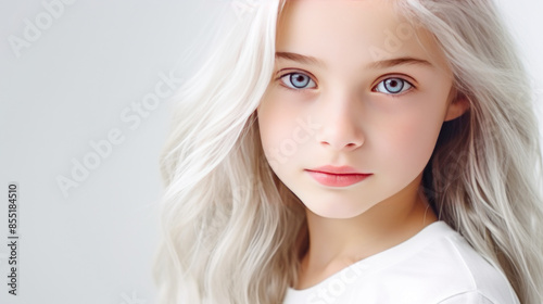 Fototapeta premium Portrait of a chic cute beautiful blonde child girl with long white hair and perfect skin, white background, banner.
