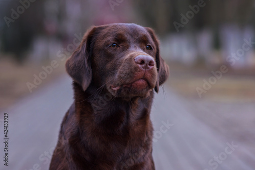 © Виктория Дубровская, Fototapeta premium portrait of a chocolate labrador dog in the park in spring