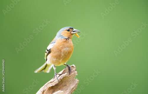 © giedriius, Obraz premium Portrait of a common chaffinch perched on a tree branch with a worm in its beak