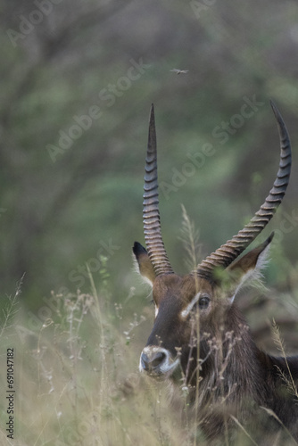 Fototapeta premium Portrait of a common waterbuck (Kobus ellipsiprymnus) walking through the...