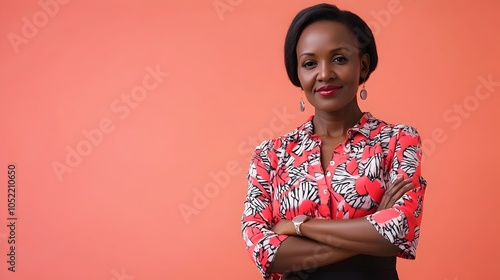 © Jittapon, Fototapeta premium Portrait of a confident and determined middle aged Kenyan woman wearing a professional blouse and skirt posing against a plain coral studio background with copy space above