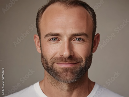 © Tanakorn, Fototapeta premium Portrait of a Confident Man with a Happy Expression, Smiling and Looking Directly at the Camera