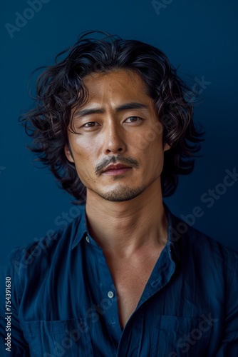 © pisan, Fototapeta premium Portrait of a Confident Middle-aged Man with Curly Hair against a Blue Background