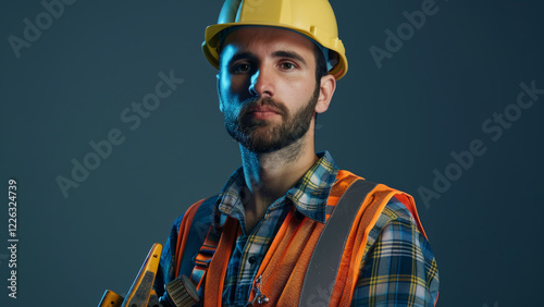 © Dis, Fototapeta premium Portrait Of A Construction Worker With Tools And Protective Gear