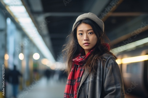 Fototapeta premium Portrait of a content asian woman in her 20s wearing a comfy flannel shirt on modern city train station