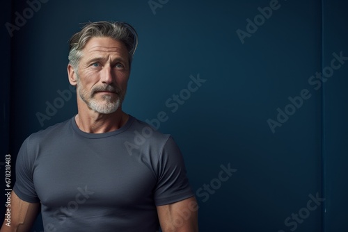 © CogniLens, Fototapeta premium Portrait of a content man in his 50s sporting a technical climbing shirt against a bare monochromatic room. AI Generation