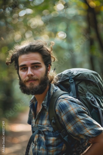 © Sasint, Obraz premium Portrait of a content traveler with a backpack