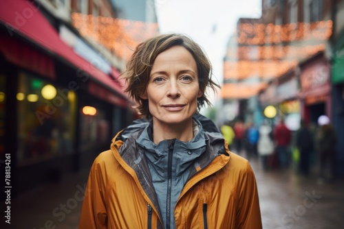 © Markus Schröder, Fototapeta premium Portrait of a content woman in her 40s wearing a lightweight packable anorak in front of vibrant market street background