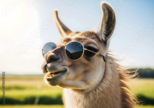 Obraz premium Portrait of a cool llama wearing round sunglasses in a sunny field.