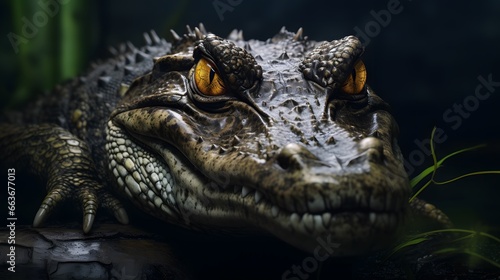 Fototapeta premium portrait of a crocodile with piercing eyes in a dark background