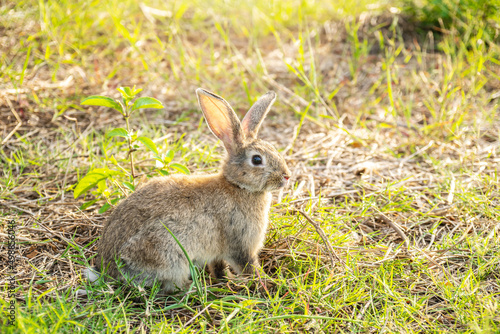 © TeTe Song, Fototapeta premium Portrait of a cute fluffy rabbit brown color with big ears, green flower meadow in a spring forest with a beautiful blurred background. Concept for spring holidays