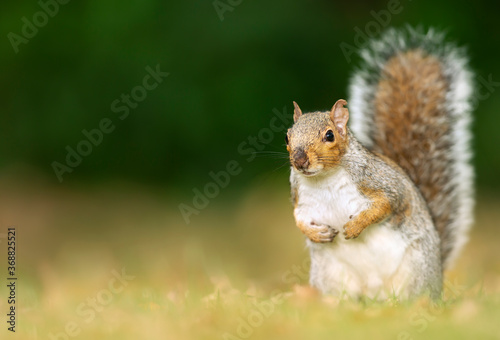 Obraz premium Portrait of a cute grey squirrel sitting in a meadow