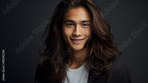 Fototapeta premium Portrait of a cute handsome happy Asian teenager guy with long hair and...