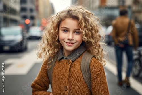 Fototapeta premium Portrait of a cute little girl with curly hair in the city