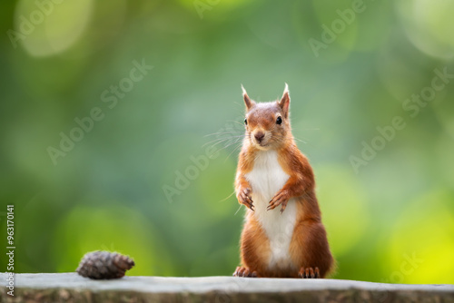 © giedriius, Naklejka premium Portrait of a cute playful red squirrel standing on a tree stump