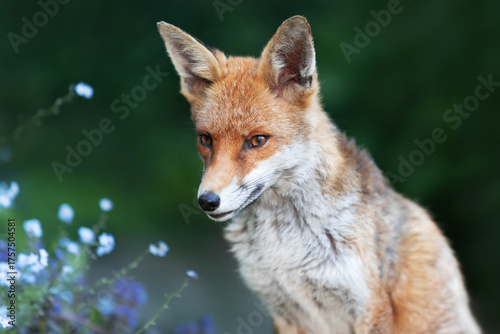 © giedriius, Fototapeta premium Portrait of a cute red fox with blue flowers in the background