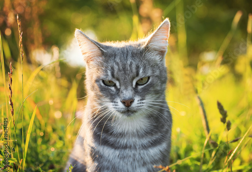 © nataba, Fototapeta premium portrait of a cute striped cat in a Sunny bright green summer meadow