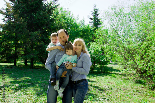 © ferkhova, Fototapeta premium Portrait of a family of four outdoors.