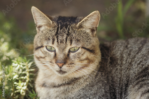© Creatopic, Fototapeta premium portrait of a fat striped cat on nature, pet walking outdoors, funny animals