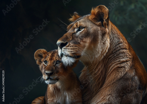 Fototapeta premium portrait of a female lion with kid isolated against black background