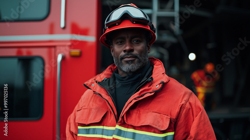 © Nokhoog, Obraz premium Portrait of a Firefighter in Uniform Standing in Front of a Fire Truck