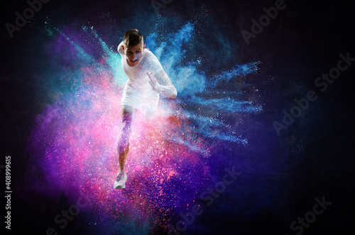 Fototapeta premium Portrait of a fitness man running on a colourful background