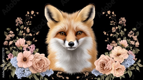 Naklejka premium Portrait of a fox surrounded by intricate floral designs, rendered in warm colors with a gothic touch, perfect for t-shirt printing
