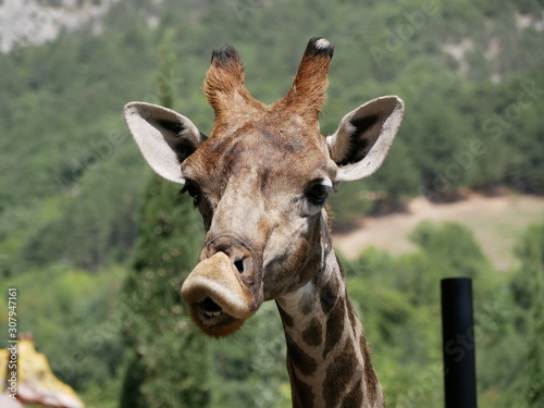 Fototapeta premium Portrait of a funny giraffe with its head turned on a Sunny summer day against a green forest background.