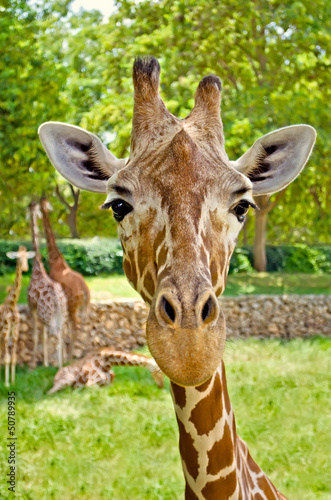 © RainLedy, Naklejka premium Portrait of a giraffe looking straight at the camera.