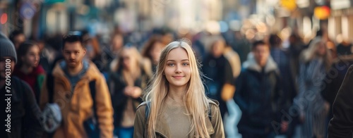 Fototapeta premium portrait of a girl in a crowd of people panorama