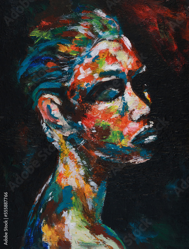 © Yurii, Naklejka premium Portrait of a girl watercolor painting. Colorful pop art portrait of a beautiful emotional girl. Conceptual abstract multicolor close up handmade acrylic painting on canvas