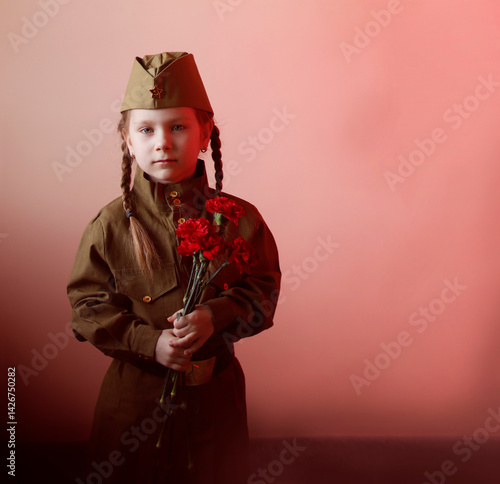 © Natalia Palii, Obraz premium portrait of a girl with flowers on Victory Day in May in a green military suit