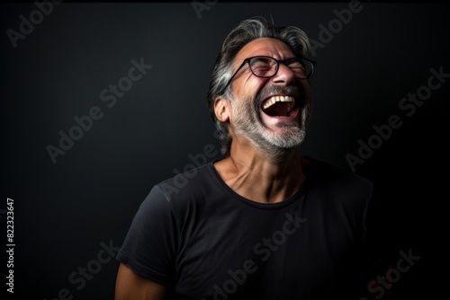 Naklejka premium Portrait of a glad man in his 50s laughing in front of bare monochromatic room