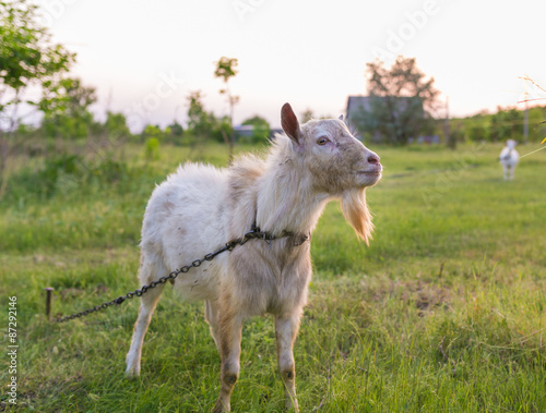 © Ryzhkov Oleksandr, Obraz premium Portrait of a goat eating a grass on meadow