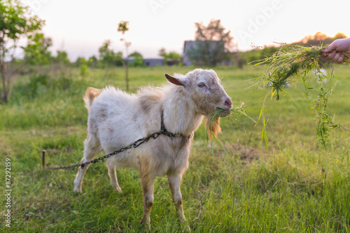 © Ryzhkov Oleksandr, Obraz premium Portrait of a goat eating a grass on meadow