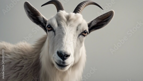 © Maule, Obraz premium Portrait of a goat with horns on a gray studio background.