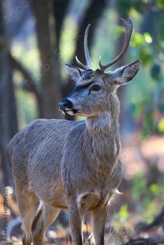 © Tasnia, Fototapeta premium Portrait of a graceful wild buck deer standing within a natural forest
