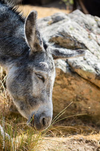 Fototapeta premium Portrait of a gray donkey in the field while feeding, short shot