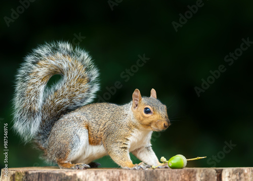 © giedriius, Fototapeta premium Portrait of a grey squirrel standing on a tree stump with acorn in autumn