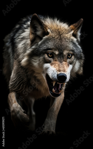 Fototapeta premium Portrait of a grey wolf on a black background in the studio. Generative AI