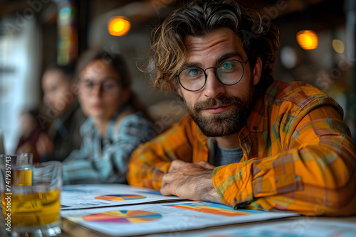 © D, Obraz premium Portrait of a handsome bearded man with glasses sitting in a pub