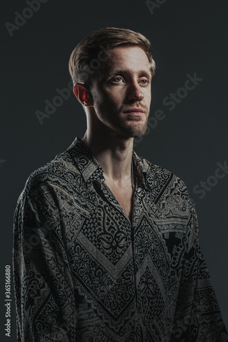 Fototapeta premium Portrait of a handsome caucasian guy in a boho shirt on the black background....