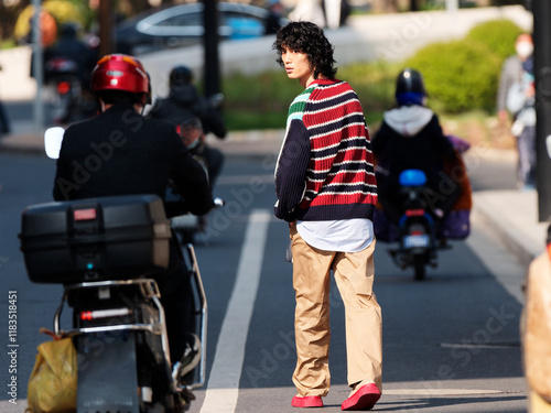 © atiger, Naklejka premium Portrait of a handsome Chinese young man with black and blue striped sweater walking in the street, young guy with black curly hair in urban background. male fashion, cool Asian young man lifestyle.