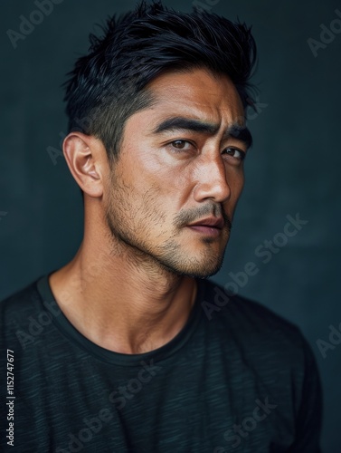 © djatu, Fototapeta premium Portrait of a handsome man with short dark hair, looking sideways.