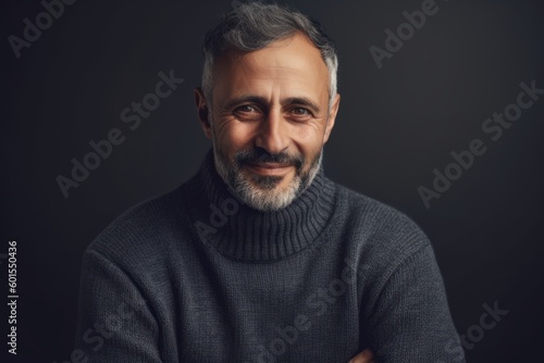 Fototapeta premium Portrait of a handsome middle-aged man in a gray sweater on a dark background