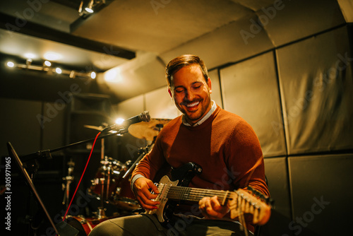 Fototapeta premium Portrait of a handsome smiling man playing electric guitar in recording studio.
