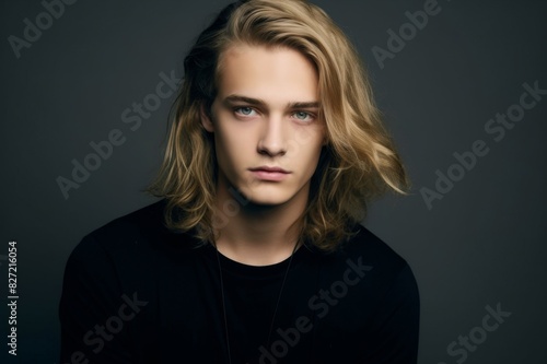© alisaaa, Fototapeta premium portrait of a handsome young blond guy with long hair on a gray background and a place for inscription