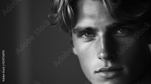 © The 2R Artificiality, Fototapeta premium Portrait of a handsome young man with medium-length wavy hair and striking facial features captured in high-contrast black and white photography.