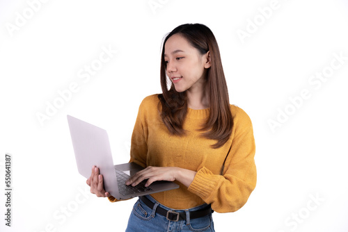 © Parichat, Naklejka premium Portrait of a happy asian businesswoman holding laptop computer and looking away isolated over white background.