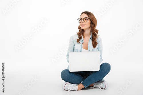 Fototapeta premium Portrait of a happy casual girl holding laptop computer